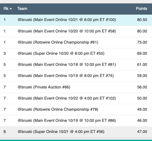 And WIN we did! Even with the competition buying the Bruski 150 and using it against me, I was still able to run wild in public high stakes leagues, with 6-of-6 Main Event squads finishing top-4 in possibly my best season ever, bringing back right around $20,000. I got another FSWA nomination to bring my total to four (including two FSWA Writer of the Year awards), which are largely because of these ranks.