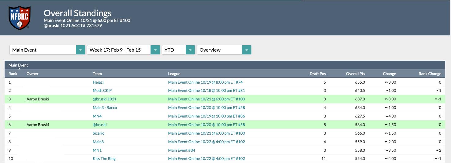 And then in high stakes I'm very encouraged with potential to win the main overall event which aggregates teams, and then over half my teams are in contention for money finishes despite some truly brutal injury situations.
