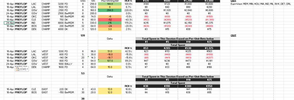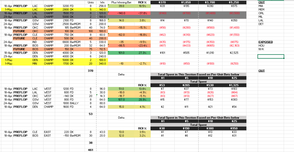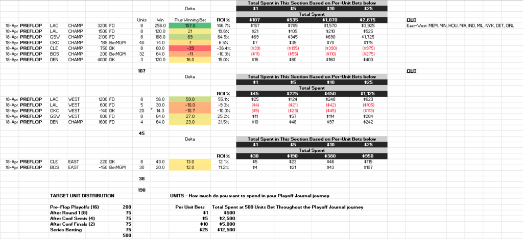 In the chart below you will see that I have 500 units I am targeting to play and 200 of them going in pre-flop on futures. Another 225 units will be planned for the rest of the journal on futures plays, and 75 units for some series betting which I’ve found to be a pretty low volume marketplace. Down at the bottom I show this distribution of what I’m targeting to play in each stage of the playoffs, as well as the series plays, and then I show you at the bottom what the total investment would be based on the size of unit you’re playing. We’ll jot down the new bets as we go. Again, this is a journal of what I will be playing.