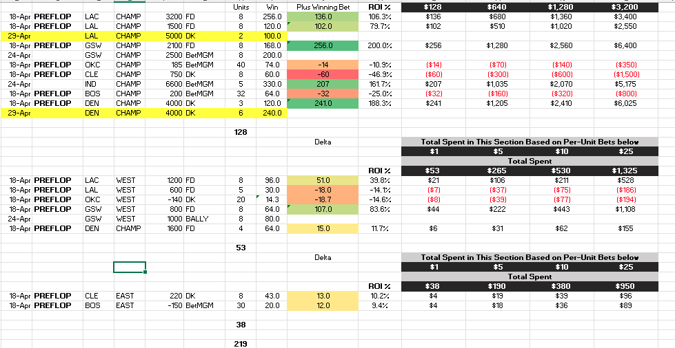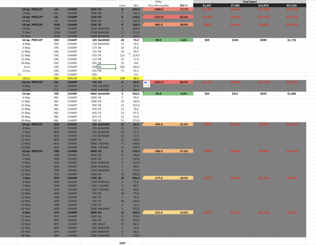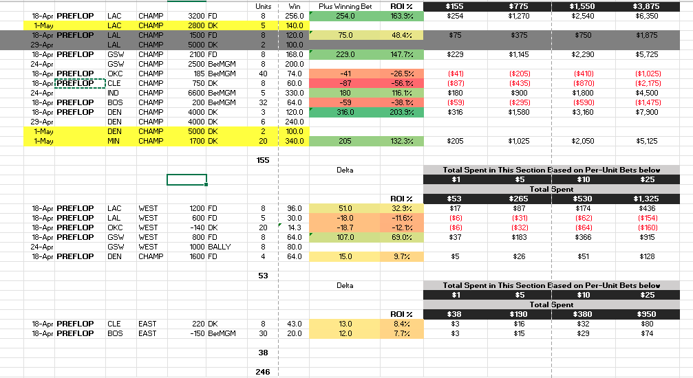 Denver +550 * 10 unitsIt was a good time to remove our exposure on Minnesota and lean into our position on Denver. We already have a big position on Golden State and now we wait to see if we can build the same type of wall we are on the championship side but we might need Minnesota to lose a game or two while OKC loses another one to really get some good traction here.