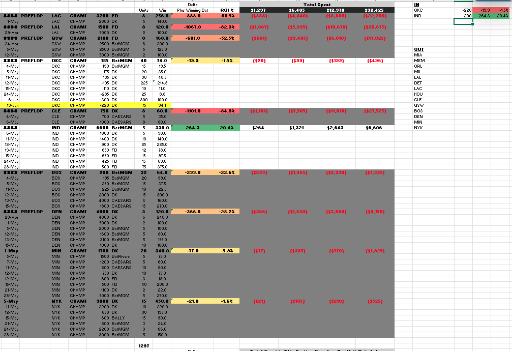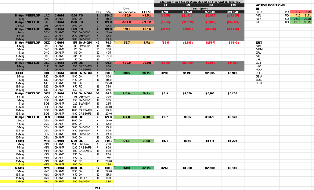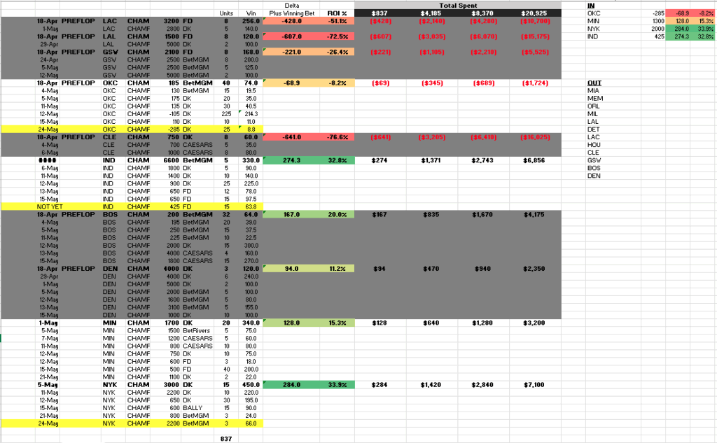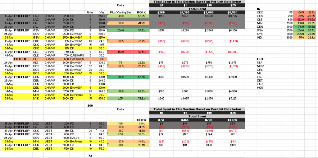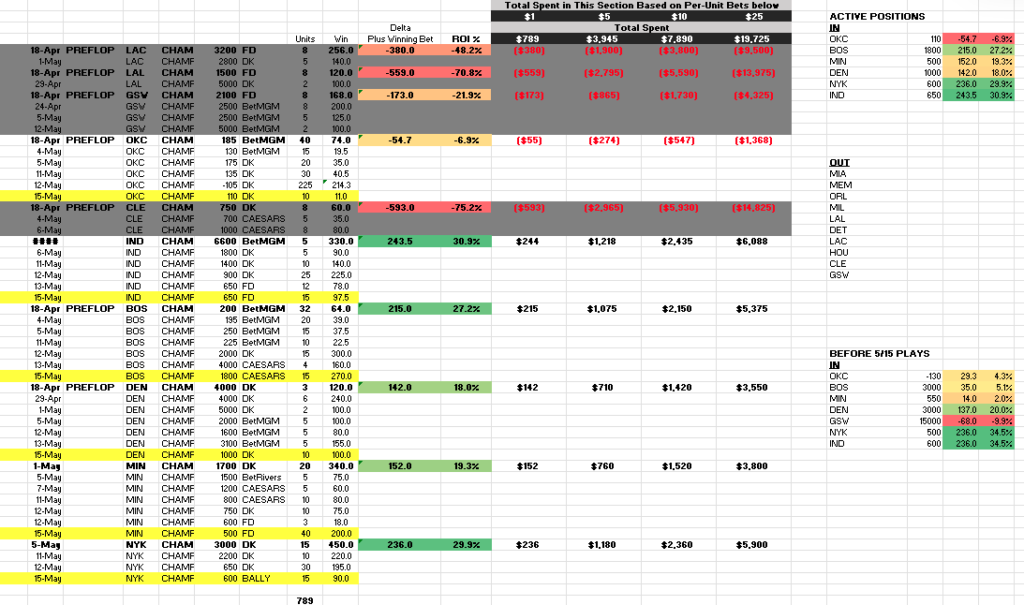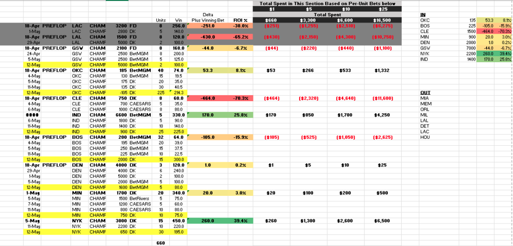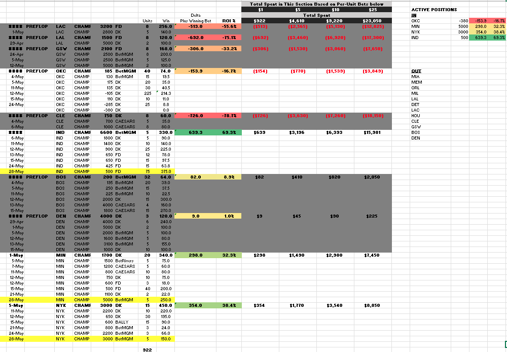 Minnesota +1700 * 20 unitsWe had been currently exposed on Minnesota but Houston doesn’t have a chance at winning a title so any hedge there is worthless but Minnesota at least functions well right now and has high-end talent with some key benefits of having a matchup for Isaiah Hartenstein with Rudy Gobert and vice versa because Chet Holmgren can’t expose him for all the Oklahoma City thunder will have to to get buckets. Julius Randle has finally gotten the message and is playing a more proportionate role and making folks like me eat my words. I could go down the rotation but the beginning is they aren’t dead money and I want to build up the other side of the bracket opposite Oklahoma City to support a buy before the competition gets whittled down. Check my worst case scenario planning to see what that play would look like sometime in the middle of the next round of the playoffs. I also do that for Boston and Cleveland to protect against scenarios of the best teams advancing. We will have big positions on teams with a punchers chance in Los Angeles, Denver, Golden State, Minnesota and if Cleveland falters for any reason we have some fun money to play with if Indiana somehow does well. We are completely exposed against New York and while I respect them they just don’t have the firepower or the mojo. The hope is that somebody complied against Cleveland, Boston or Oklahoma City and we can catch any two loss scenarios in an upcoming series against their opposition. If that happens I believe we will have access to numbers better than what we show in the worst case scenario. If we decide to lean all the way into Oklahoma City at any point in time we probably have a really good shot at 20% ROI. The hope will be that we can fade Cleveland and leverage the still strong Boston odds if Oklahoma City continues to steamroll, which is the one outcome I’m not sure of. I’m not sure of it because I don’t know how high they can climb because I don’t put any limit on it. With Boston we have seen enough of them in high leverage games to know what they are punching power is and of course it is substantial. We have a similar question mark with Cleveland, but that tilts more toward whether or not the regular-season was overrated or not and we have some evidence in past playoff performances that it could be. My counter to that is that I don’t know if Evan Mobley is some sort of force multiplier in the same thing goes for their bench/depth, which is daunting. The counter to the counter is that Oklahoma City and Boston present defenses that are as potent as we have ever seen. Overall, we have some downside but we have mitigated it and we are ready to strike at any time the league decides to go off script.