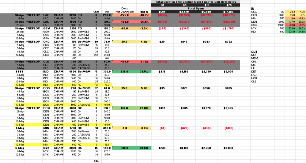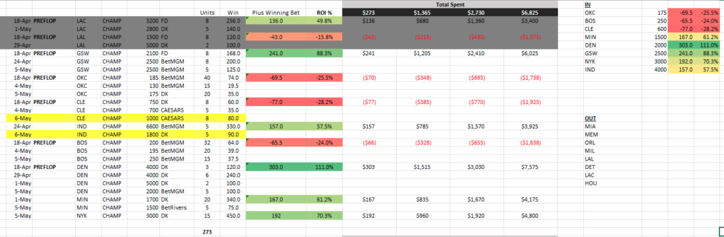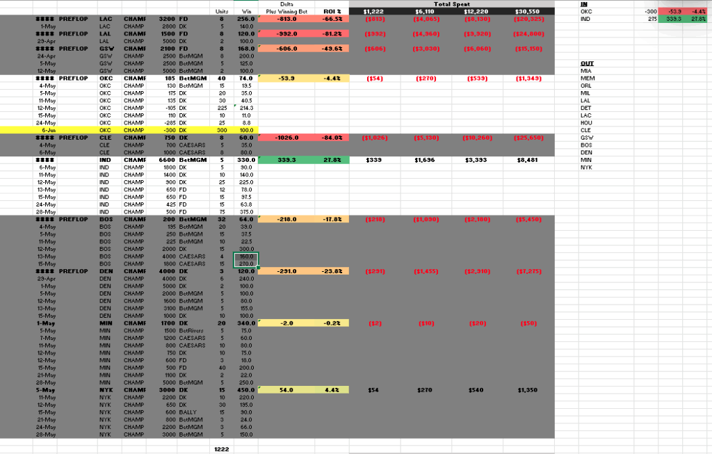 Golden State +5000 * 2 unitsFrom a betting perspective we got exactly what we needed and then some after New York beat Boston and then of course whatever happens with Jayson Tatum’s injury isn’t helping matters. DraftKings tossed out a +2000 so 15 units covers our Boston exposure, leaving just Cleveland exposure that we can clean up along the way if necessary. The big story here is that we are making our play on OKC and guaranteeing profit on them, while putting the teams with 3-1 leads into big positions that we can either hold onto if things are going well (and maybe even built them theoretically), while using them as a hedge through the rest of the playoffs. If Boston somehow rallies we are within striking distance and with Cleveland we now have major exposure but that’s pretty much it. The rest of the board is covered and as of now we are looking at double digit percentage returns at minimum if everything holds true to form.
