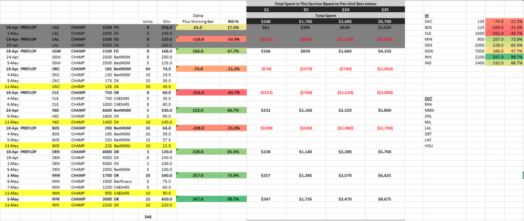 New York +3000 * 5 unitsThere is a gap between the amount it costs to bet the Thunder and the Pacers if you want to exclude New York and Minnesota and at the same time you can also get New York and Minnesota at amazing prices right now. So I’m going to do everything but bet the Thunder in hopes we can get a reprieve on the price after a Minnesota win and my theory is that the market won’t move too much if OKC knocks them out tonight. I have about 400 units earmarked for Oklahoma City and because we built up Indiana we will have a spread of about zero to -30 units for OKC and 200+ units for Indiana to head into the Finals with. If New York keeps winning we will have enough opportunity to build them up but overall this is about dealing with the heavy price on Oklahoma City and then hoping that their defense can’t crush Indiana and we can get some better pricing on them throughout that series to end up with about 40-80 units of profit, which won’t be great but Oklahoma City was tough to bet on this year and maintain guaranteed profit.